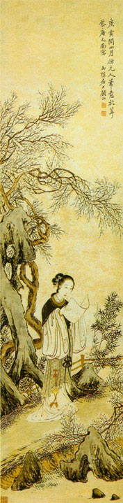 (右:梅邊吟思圖)很多年後,當那個與她攜手一生的人死前,念的是多年以前她寫給他的詞——願得一心人,白首不相離。他一直耿耿的是當年,那件傷她至深的事。 突然之間,她早已經枯涸的眼眸裡,又蕩漾起水意,因確知他的死,而日漸荒蕪的心,如夢方驚。 ——他仍記著,那是多年前的事了…… 她淚眼盈盈。這眼依稀還是初遇時,那一雙橫波目,隔著湘簾,望過來。 霎那之間,綠綺琴的琴心變了—— 「蒹葭蒼蒼,白露為霜,所謂伊人,在水一方。」 他仿佛真見著古人歌詠的女子,素色衣裙,幽立水邊。風拂過,湘簾輕擺,悠悠蕩蕩,如女子乘舟涉水而來, 輕微的響聲,在他的心裡變得清晰劇烈。 綠草蒼蒼,白露茫茫。他看見命中註定的女人等待著他,因為她映在水裡的倒影,正是他。 揚眉輕瞥,他不動聲色地窺望。他的才名,或者單單是這把梁王所贈的綠綺琴,就足以使身邊這些附庸風雅的人裝模做樣地閉目欣賞了。 「溯洄從之,道阻且長,溯遊從之,宛在水中央……」 他在意的,是簾後隱而不露的知音。她的身影雖然隱沒在簾後,仍可窺見伊人眉似遠山,面若芙蓉,遠遠近近,像一幅清麗的畫——蜀山蜀水中盛開的一蕖芙蓉。只是,他在水邊徘徊四顧,仍是不得親近。 他相信自己再高超的琴藝,在她的面前亦不艱深,一曲《鳳求凰》在別人聽來如聆仙樂,於她卻是尋常。不過是兩人對坐交談,娓娓道來。他們是彼此心有靈犀的兩個人。如同這天地間只剩下兩個人的清絕,一切的手段方法都用不著。由你心入我心的自在無礙。 簾風後面,鬢影釵光,桃花旖旎,她的身軀輕輕顫動,聞弦歌而知雅意。 鳳兮鳳兮歸故鄉,游遨四海求其凰。 時未遇兮無所將,何悟今夕升斯堂。 有豔淑女在蘭堂,室邇人遐毒我腸。 何緣交頸為鴛鴦,相頡頏兮共翱翔。 鳳兮鳳兮從凰棲,得托子尾永為妃。 交情通體必和諧,中夜相從別有誰? …… ——司馬相如《鳳求凰》 他贊她高貴如凰。是的,他在示愛,他要「求」她!她砰然心悸!這一曲畢,她推說熱,回到內堂,她需要凝神。沒有人知道,在剛剛的幾分鐘之內,她萋萋的芳心已被打動。17歲時嫁了人,那時只是年少夫妻,並不深知愛的歡娛和哀痛,還沒來得及學會愛,不足一年,他死去,她回到娘家。 對那個人的思念,後來想起來,更多地是對自己的憐憫,將所有的青春美貌放諸他身上的一場豪賭,結果還沒開局就被死亡OUT。一切還沒開始,不應該就此結束。野心而放任的文君並不甘心。或許,每一個失敗的女人都會不甘心,但是卓文君,無疑多了幾分勇氣,幾分眼光。 回家後她一直這樣寂寂地,父親以為她是為情所傷,因此並不願拘禁她。沒有一個慈愛的父親願意拘禁自己的女兒,何況,在他眼中的女兒是如此的溫柔,美麗,憂傷。 他好像並不知道女兒的多情。所以後來,她才能如此輕易地和司馬相如夜奔。 豈只是多情,其實文君的心內一直如薔薇盛放。只是她不打算讓父親走近她的花園,窺見她心底的秘密。不過,多情不等於放蕩,如果遇不上讓她陽光豐盛的男子,那麼文君寧可一生寂寂。 他來了,這個說話略有口吃的俊雅男人,巧妙地避過了自己的弱點。他用綠綺傳情。琴音如訴,她心動神馳。 鳳兮鳳兮非無凰,山重水闊不可量。 梧桐結陰在朝陽,濯羽弱水鳴高翔。 文君夜奔。相如家徒四壁,她拋下千金之身,當壚賣酒。他也捨得下文人的架子,風流灑脫,穿上粗布衣,就在小酒店裡當起了跑堂,和夥計一起洗碗刷碟。 想必真是存了寒磣老爹的意思,使的苦肉計。不然在成都賣酒就行了,何必巴巴地跑回到臨邛來,好開不開,把個酒店就開在老父家門口,挑明瞭試驗卓王孫的舐犢之心有多深:我已經淪落到這般田地,你兀自高堂美酒,我看你忍不忍心? 主意必定是文君拿的。只有女兒才最瞭解自己父親。她料定父親過不了多久,一定舍不下面子,會來阻止她的「莽撞」。果然!父親很快就登門「求和」。 鬧市當壚,她的人就是這樣的生動活潑,出人意料。相如也好,是才子,卻不拘泥於行格,沒有迂腐文人的黴味,滌器街頭,依然坦蕩蕩自在歡騰。 這兩個人行的妙事,千載之後還讓人莞爾。 相如撫琴,文君夜奔,他們恰好是活潑潑一對新鮮天地裡的新鮮人。彼時大漢王朝鼎革肇新,傳不數代,正是好日子初初開端,好像三月桃花苞,粉粉嫩嫩,有無盡的春意在裡面。天地間亦是紅日朗朗,山河浩蕩。盛世人心寬闊,有什麼容不下、看不過的?然而,過了這幾百年,數到宋、元、明你再看,這樣的浪漫故事再不曾有過。不是這人世間再沒有第二個卓文君和司馬相如,而是在他們的身後,「浪漫」這扇門已經慢慢合攏,久久不曾打開了。 |